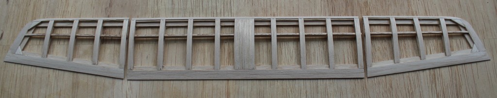 Nosník konců křídla (uší) je na konci zúžený na 3 mm. Tvrdší balsu nosníku je dobré řezat žiletkovou pilkou. Přilepte hlavní nosníky křídla na spodní žebra křídla a opět nechte zaschnout. Postupně si nařežte ostatní „dlouhé“ lišty křídla. Pro tyto pásky použijte balsu měkčí. Měkčí balsa se vám bude lépe brousit do požadovaného profilu křídla.