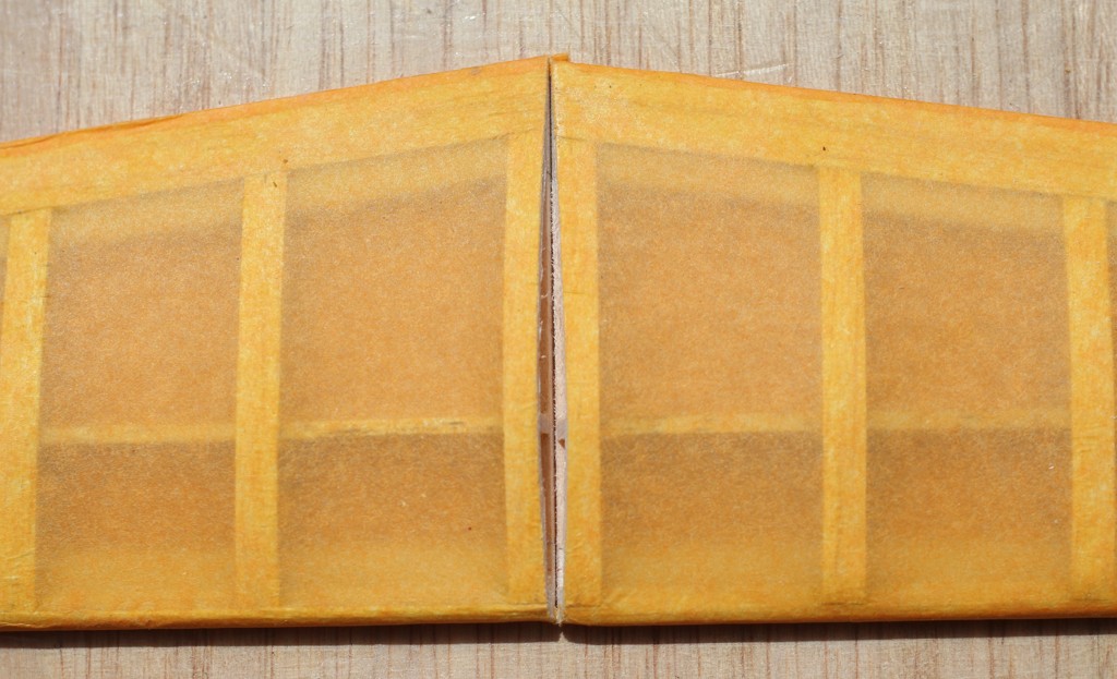 Stejně postupujeme i u uší křídla. Potom díly křídla k sobě slepíme a necháme dobře zaschnout. Pokud jste potahovali modelářským potahovacím papírem, tak postupně nalakujte křídlo dvěma vrstvami zaponového laku.